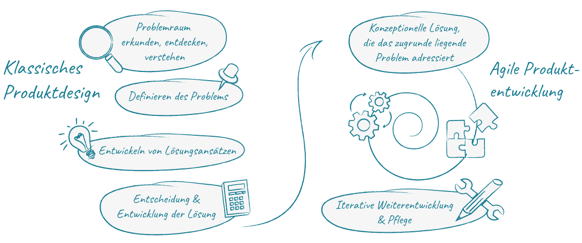 Ein klassischer Produktdesign-Prozess (Wasserfallmethode) ist in der physischen Welt absolut sinnvoll. In der digitalen Produktentwicklung kann ein langer, detaillierter Vorlauf jedoch zum Risiko werden: Anforderungen verändern sich, Technologien entwickeln sich schnell und Konzepte verlieren ihre Relevanz.