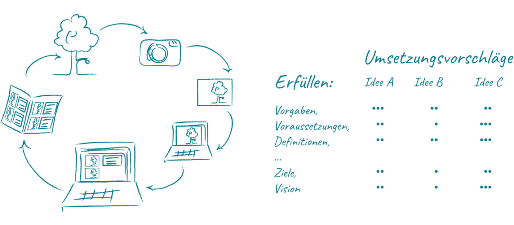 Gemeinsam erkennen wir Muster, ordnen Zusammenhänge und machen sichtbar, was wirklich gelöst werden muss. So entsteht ein gemeinsames Verständnis, aus dem tragfähige Konzeptideen wachsen. Gibt es mehrere mögliche Ansätze, werden diese nach Zielen, Aufwand und Nutzen bewertet: