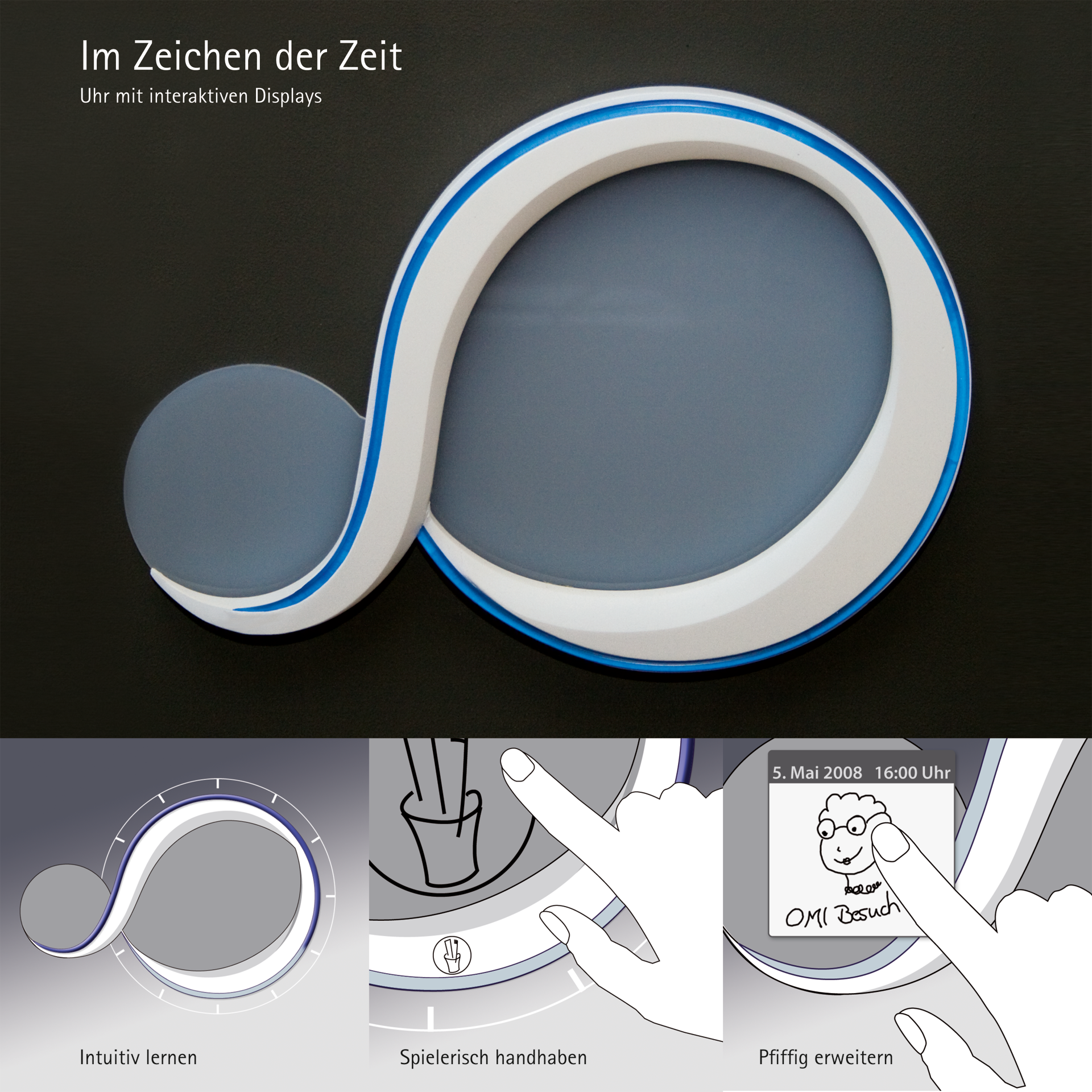 Die beiden Zentren der Uhr bilden große interaktive Displays. Stellen Sie sich vor, Sie könnten mit dem Finger drauf malen. Oder Ihr Kind. Malen wir gemeinsam einen Zahnputzbecher. Ist dieser fertig, umkreisen wir ihn mit dem Finger und bestätigen mit dieser Geste den „Termin“. Jetzt können wir das Bild anfassen und ziehen es zum Rand der Uhr, auf den gewünschten Zeitpunkt. Wenn nun der leuchtende Streifen seine Bahn über den Tag zieht und dort ankommt, wo es Zeit ist, die Zähne zu putzen, leuchtet der Zahnputzbecher auf dem großen Display auf. Viele weitere Aktivitäten können auf diese Weise ganz nach Wunsch angelegt werden.